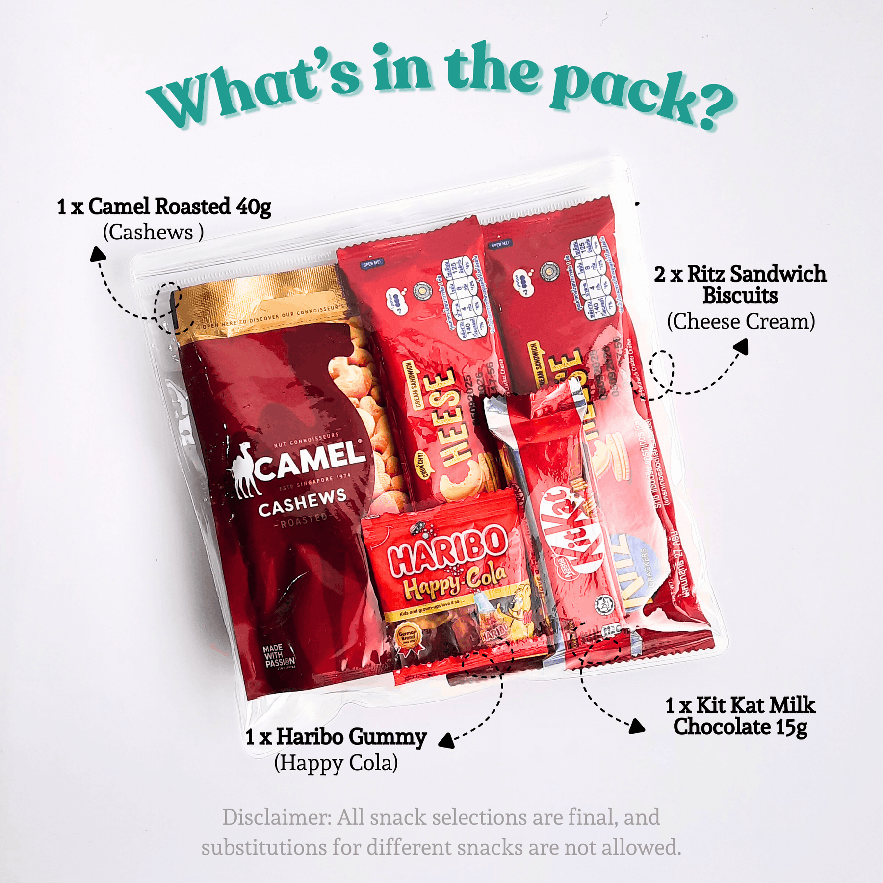 • Snacks in the pack are fixed and cannot be replaced, so you can be assured every pack is prepared the same way with quality in mind.