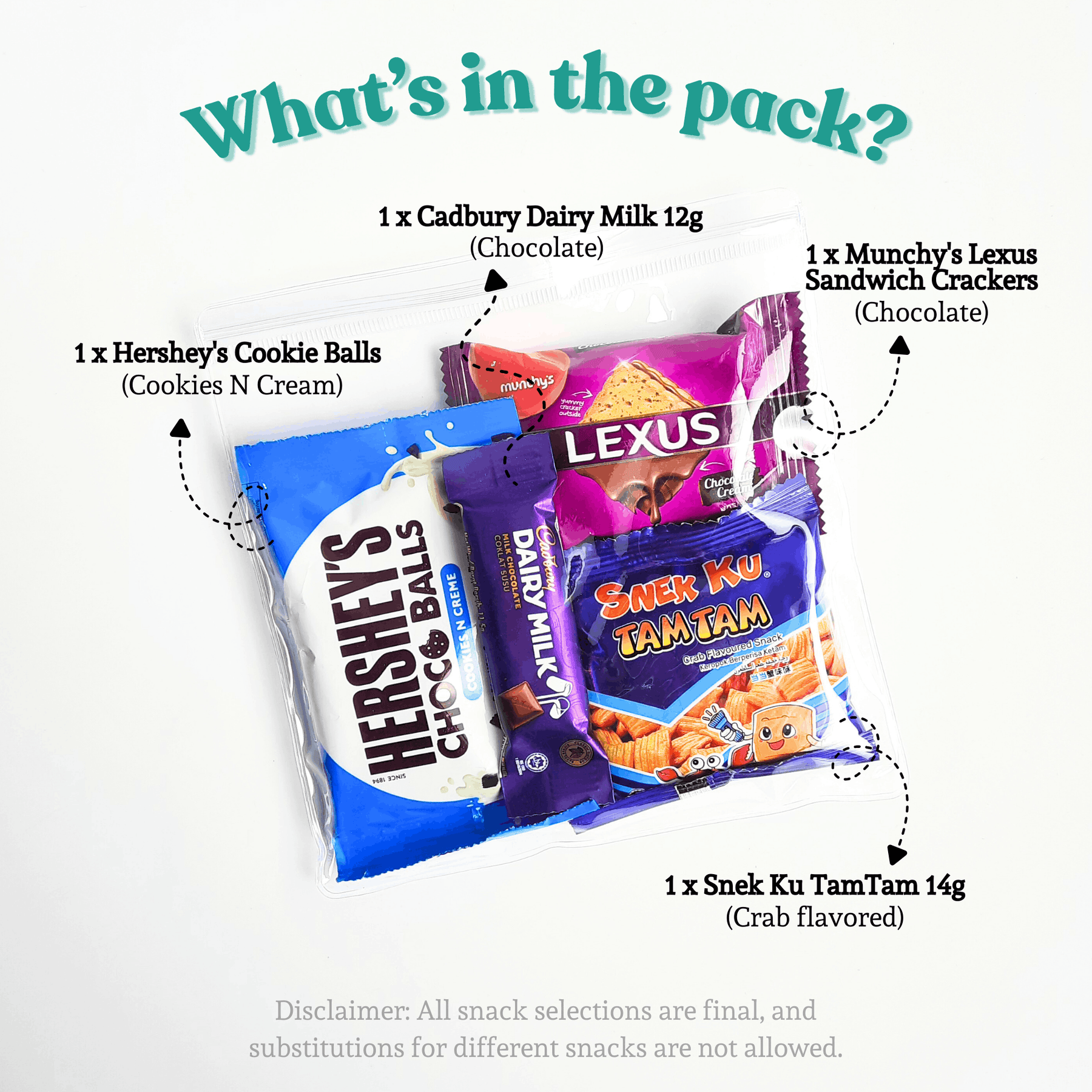 • Snacks in the pack are fixed and cannot be replaced, so you can be assured every pack is prepared the same way with quality in mind.