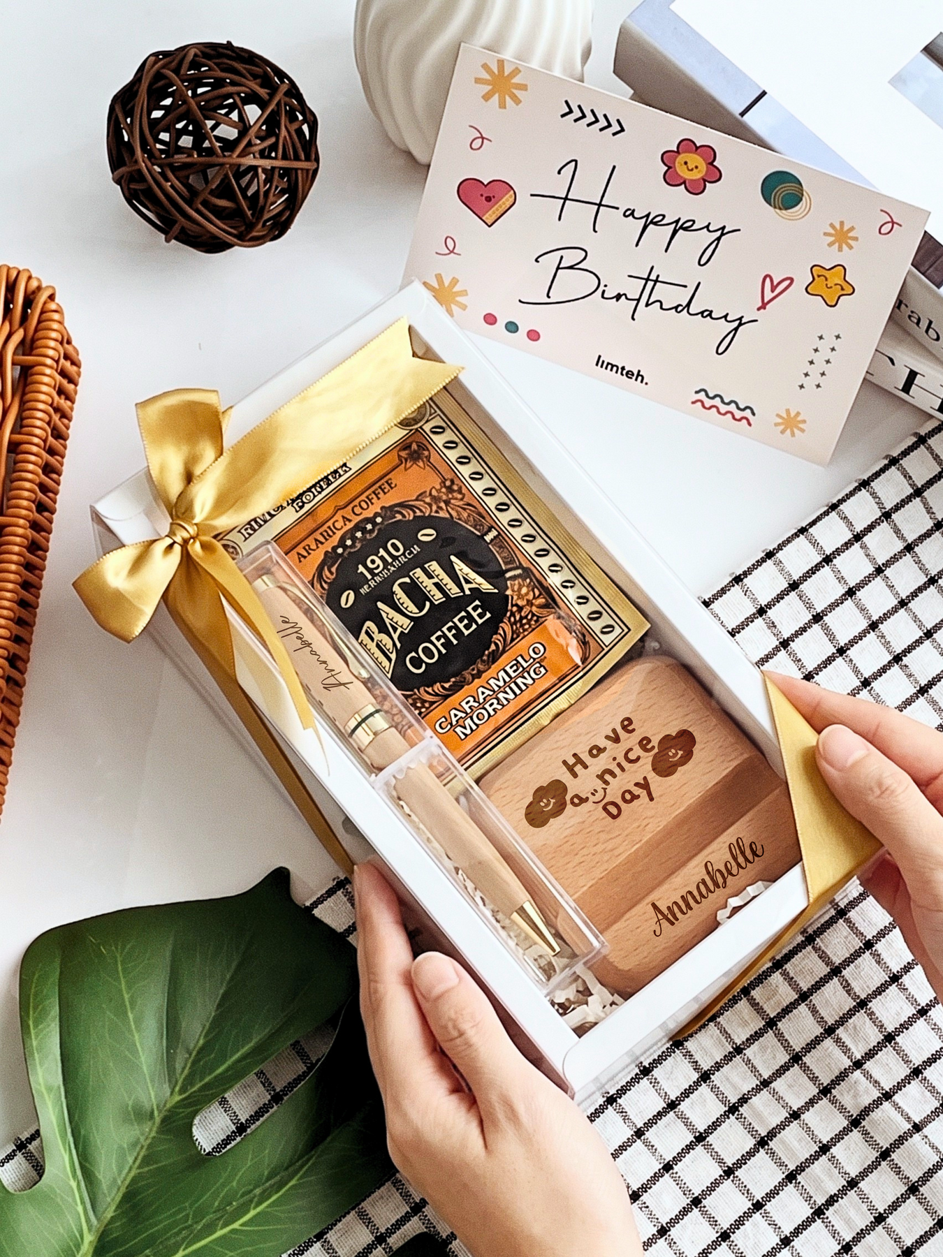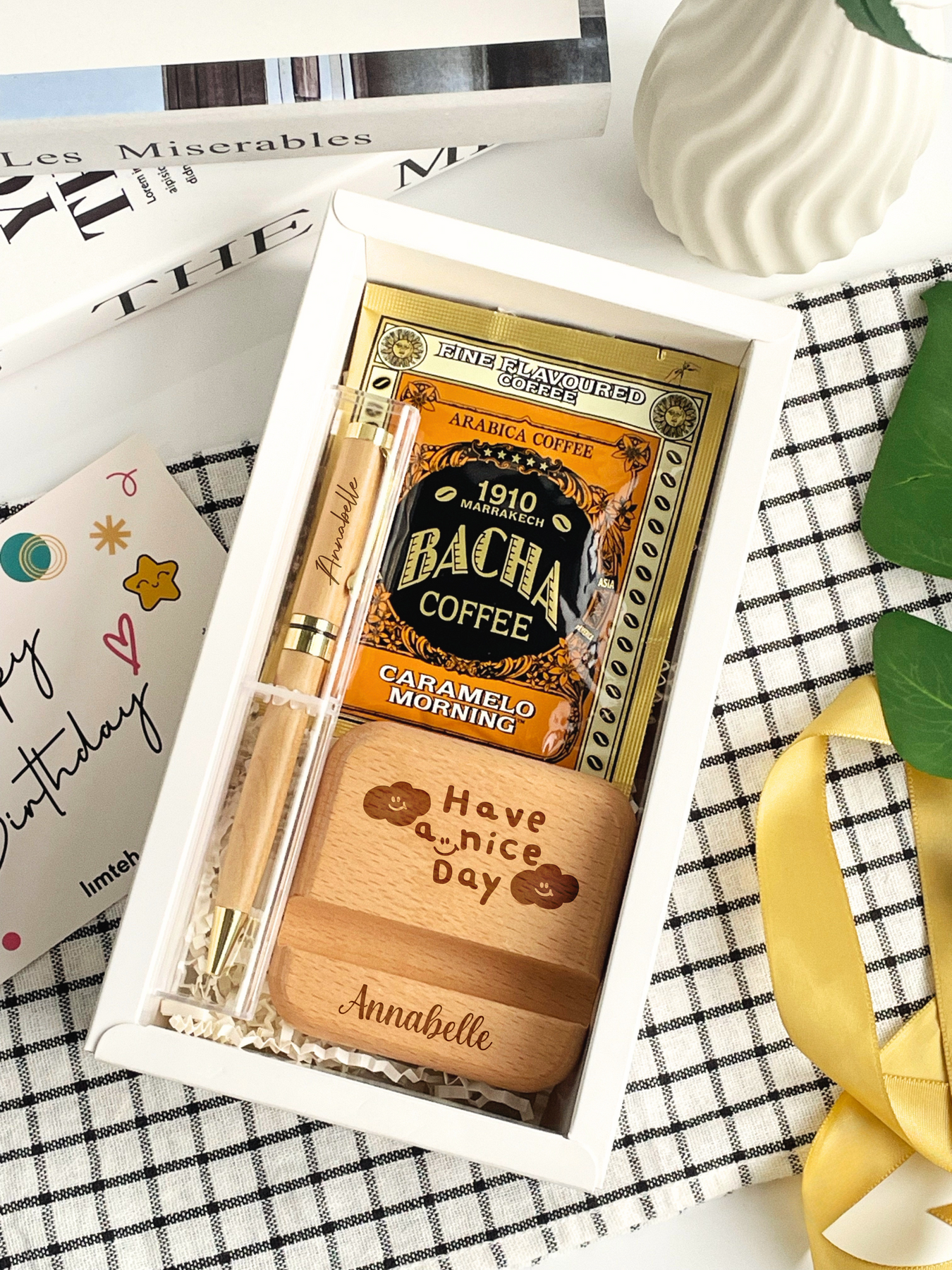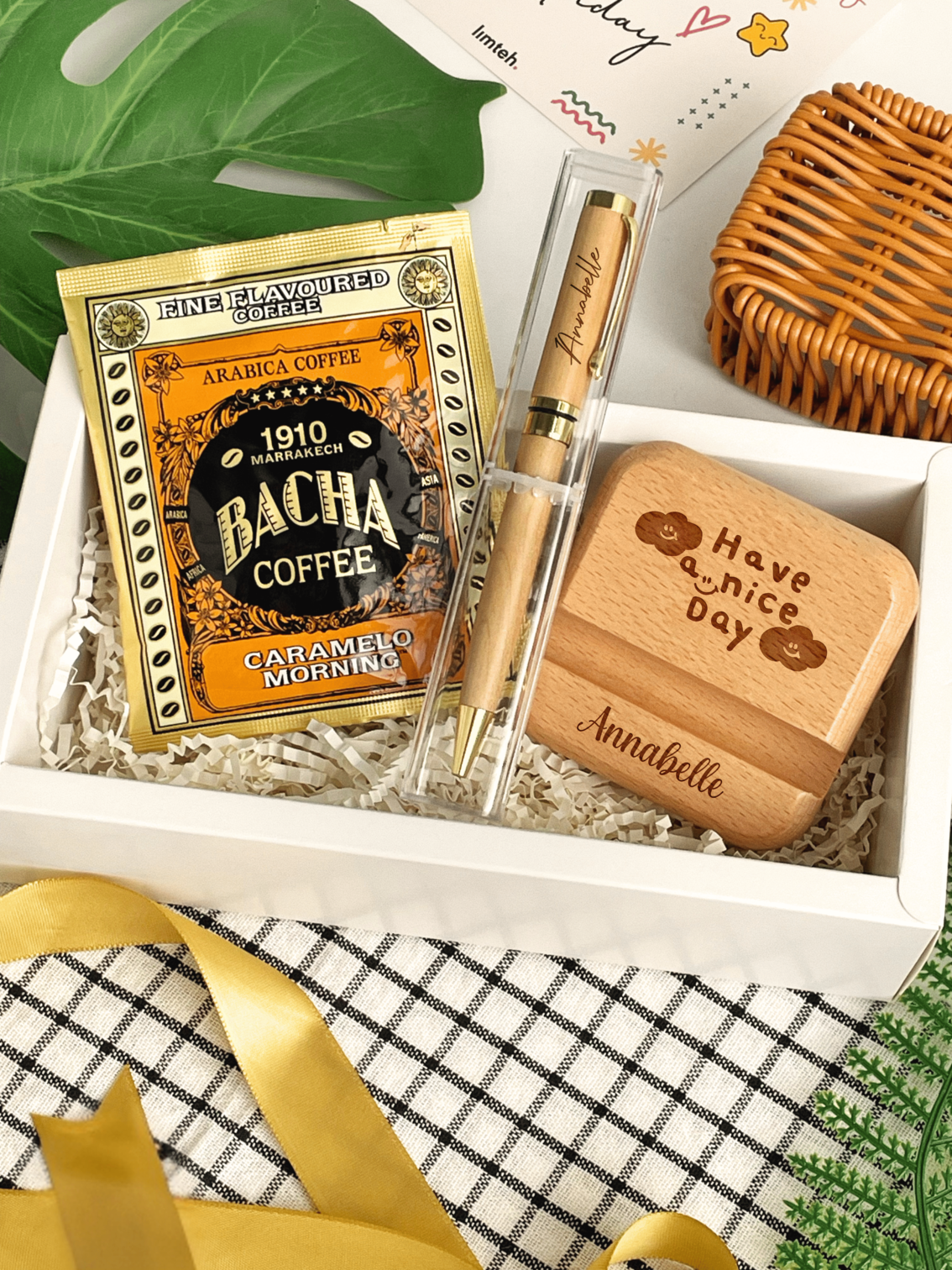 Elevate the art of gifting with the Oak & Aroma giftset, featuring a handcrafted wooden pen in maple color, a minimalist wooden phone stand, and the aromatic luxury of Bacha Coffee. Elegantly presented in a white box finished with a signature gold ribbon, it’s the perfect surprise for family, friends, or someone special. Gift a moment of warmth and sophistication, and create a memory that leaves a lasting impression.